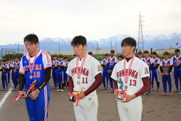 | 左から小山怜央選手(最優秀選手賞 ・優秀投手賞)、海邉和也選手(敢闘賞)、平山純也(優秀打撃賞) |