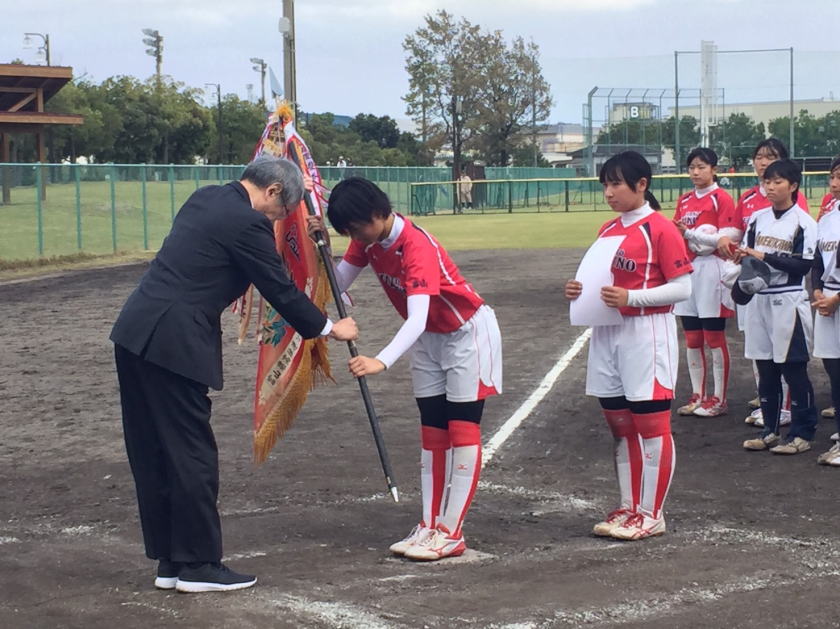| 賞状、優勝旗を受ける西尾主将と江川選手 |