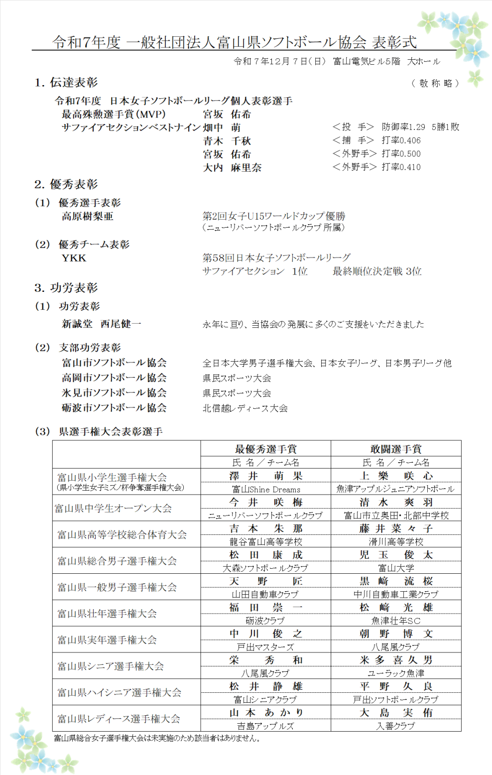 ★令和6年6月29日(土) 令和6年(一社)富山県ソフトボール協会支部合同懇談会を開催、上記の皆さんが表彰されました。