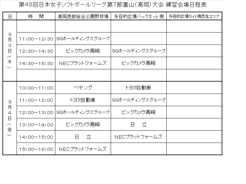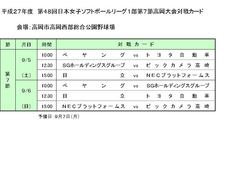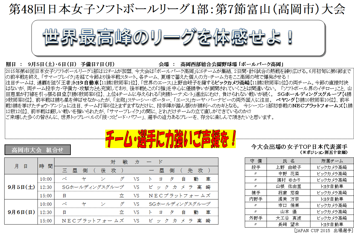 ★チームバス・応援バスは外野フェンス外 レフト〜ライト通路が駐車場となります。 ☆平成27年度 第48回日本女子ソフトボールリーグ1部全試合対戦カードPDF